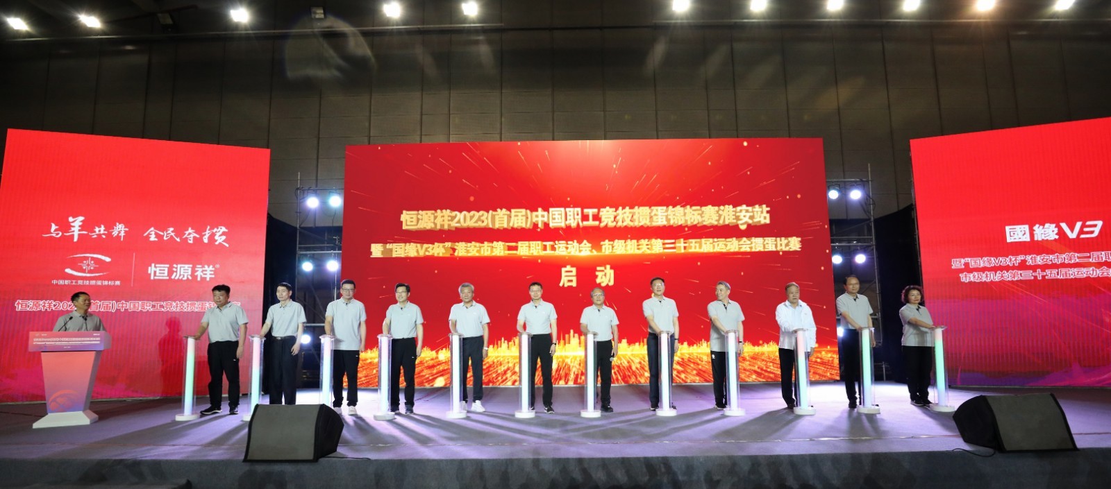 5月20日,恒源祥2023(首届)中国职工竞技掼蛋锦标赛淮安站暨“国缘V3杯”淮安市第二届职工运动会、市级机关第三十五届运动会掼蛋角逐于江苏淮安乐成举办。赛事共吸引来自淮安市各市级机关、各县区企事业单元以和天下各行业体协及新闻媒体的近700名职工选手,于市级机关行政中央、市体育中央两个赛场睁开比赛,别离竞争机关组及公然组的桂冠,妙手云集,盛况空前!